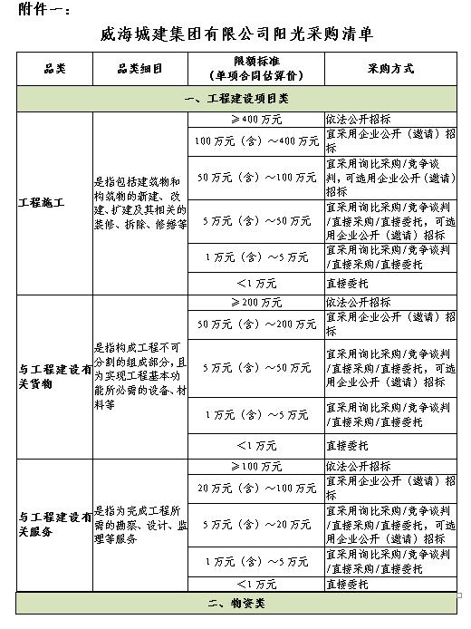 第十七條 本制度規(guī)定的采購(gòu)范圍包括工程建設(shè)項(xiàng)目、物資和社會(huì)服務(wù)的招標(biāo)采購(gòu)(詳見附件一《威海城建集團(tuán)有限公司陽(yáng)光采購(gòu)清單》)。
